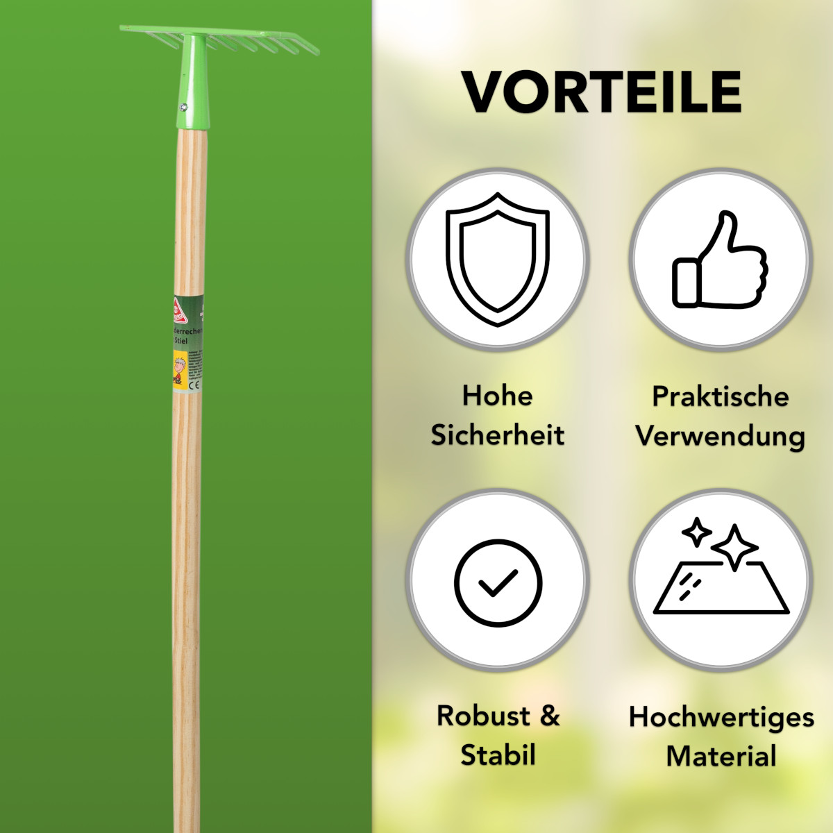Der Rechen besteht aus robustem, pulverbeschichtetem Metall und ist mit einem glatten Holzstiel (ca. 76 cm) ausgestattet, der angenehm in kleinen Händen liegt. Dank der abgerundeten Ecken und Kanten sowie schadstofffreien Materialien ist für maximale Sicherheit beim Spielen gesorgt.