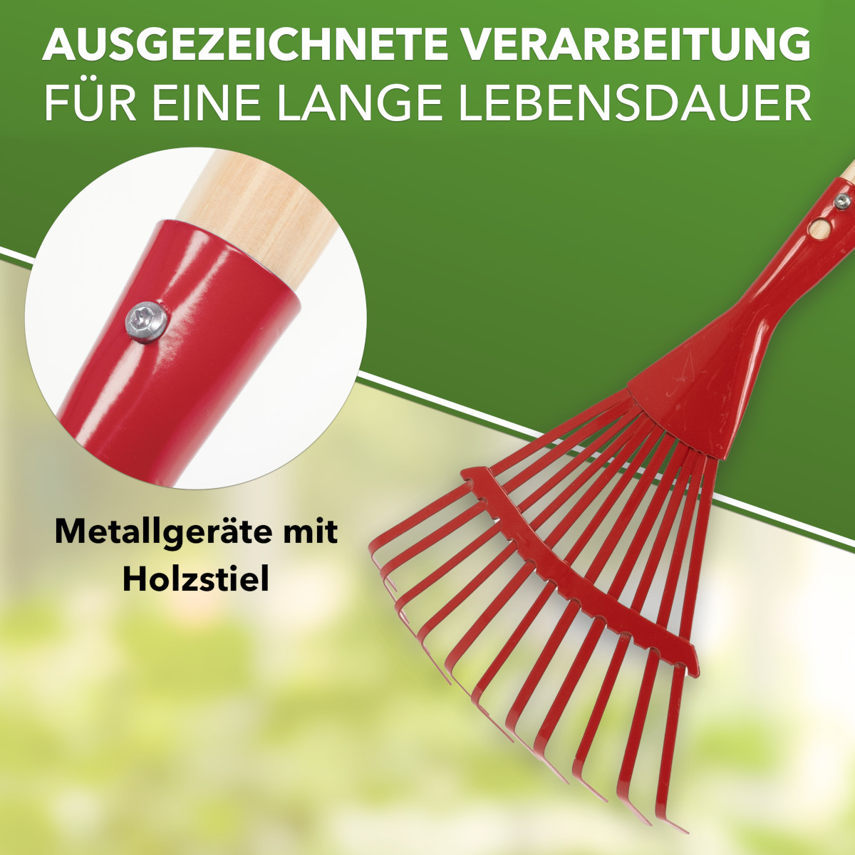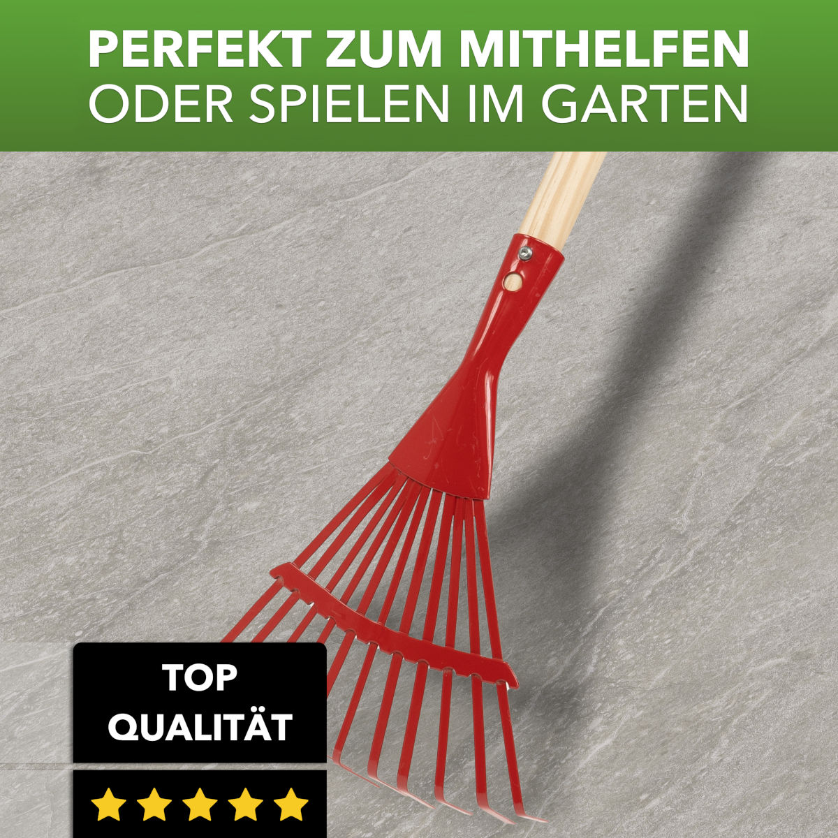 Der Besen besteht aus robustem, pulverbeschichtetem Metall und ist mit einem glatten Holzstiel (ca. 76 cm) ausgestattet, der angenehm in kleinen Händen liegt. Dank der abgerundeten Zinken und schadstofffreien Materialien ist das Spielen sicher und unbedenklich. Das strapazierfähige Material sorgt zudem für eine lange Lebensdauer – ideal für Garten, Terrasse oder Sandkasten.