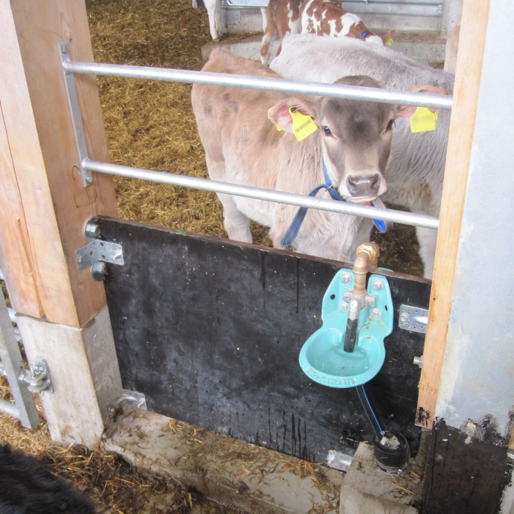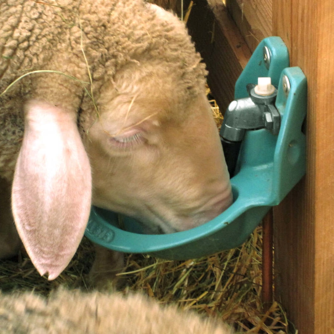 Das Tränkebecken Mod. 375 ist mit einer Lernhilfe für Schafe, Ziegen, Kälber und Hunde ausgestattet. Für ein gesundes Wachstum Ihrer Jungtiere ist es notwendig, dass die Tiere möglichst bald und selbstständig ausreichend Wasser aufnehmen. Daher wurde hinter dem Rohrventil eine Lockwassermulde eingearbeitet. Jungtiere, die eine Betätigung der Tränke noch nicht erlernt haben, schlecken zunächst das Restwasser aus der Tränkschale. Anschließend wollen sie das Wasser aus der Lockwasser-Mulde aufnehmen. Dabei betätigen sie automatisch das leichtgängige Rohrventil und erlernen die Funktion. Eine frühzeitige, ausreichende Wasseraufnahme wird somit gewährleistet. Die Wassermenge ist stufenlos von außen über eine Regulierschraube einstellbar. Durch die speziell konstruierte Rückwand ist die Montage an Standsäulen, Wänden oder sogar in 90°-Ecken möglich.