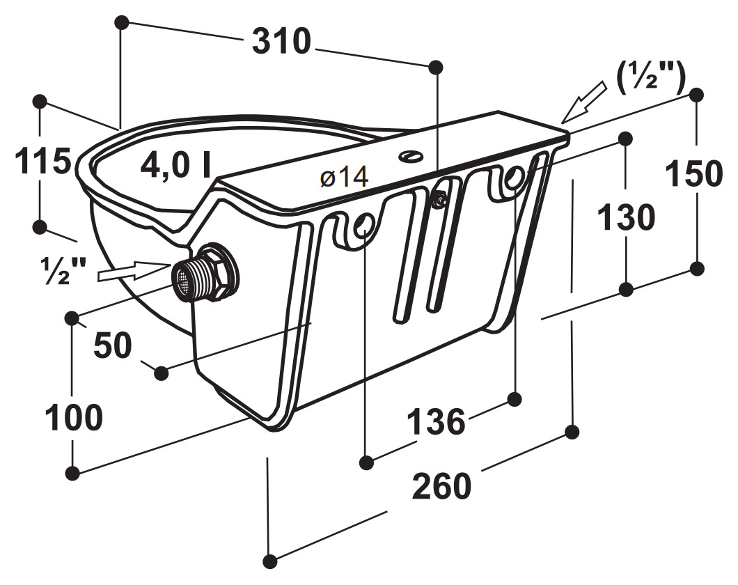 Das Schwimmer-Tränkebecken Mod. 340 von Suevia verfügt über eine große Schale aus emailliertem Gusseisen und ist für den Einsatz im Hochdruckbereich bis max. 5 bar ausgelegt. Das Schwimmerventil ist für die Tiere unzugänglich hinter der abnehmbaren Schwimmerabdeckung aus Edelstahl montiert. Der Wasserstand wird automatisch durch das Ventil reguliert, sodass die Tiere immer frisches Wasser zur Verfügung haben. Die abgerundeten Ecken und Kanten beugen Verletzungen vor. Die Tränke ist bestens für Damwild, Kälber, Pferde, Rinder, Schafe und besonders für Ziegen geeignet.