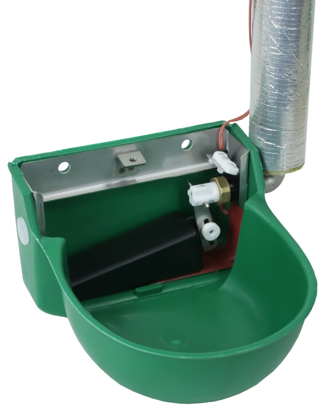 Das Schwimmer-Tränkebecken Mod. 130P-H von Suevia verfügt über ein eingebautes Heizelement (24V, 20W), wodurch die Tränke im Ventilbereich bis zu -10°C frostfrei bleibt. Das Heizelement ist für die Tiere unzugänglich hinter der abnehmbaren Schwimmerabdeckung aus Edelstahl montiert und mit einem 3 Meter langen Anschlusskabel versehen. Über einen integrierten Thermostat wird die Heizung bei +5°C ein- und bei +12°C automatisch wieder ausgeschaltet. Zu Stromversorgung ist ein Suevia Transformator 230/24V erforderlich (Ausführung 50 bis 400W).